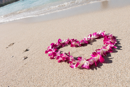 蘭の花ガーランド ネックレス愛ハート ホワイト海砂のビーチ ロマンチックなカップル ハネムーンでハワイ旅行 の写真素材 画像素材 Image